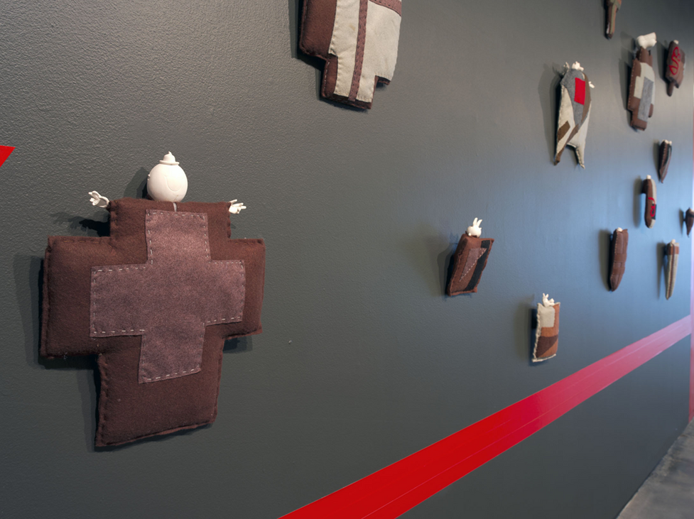 This installation featured hand-stitched felt shapes emblazoned with Malayalam script, the indigenous language of the Indian state of Kerala. The geometric shapes in the greys, browns, black and red typical of Russian Constructivism had small white heads reconfigured from free toys for children that are given out with McDonalds food packs. Scattered across the wall like Constructivist icons across a vast mural, the work addressed the impact of global marketing on local cultural identity.